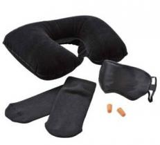 Set de voyage. Ce set vous sera très utile lors de vos déplacements. - Il contient un masque, des bouchons anti-bruit , un oreiller gonflable et des chaussettes de voyage - PVC. - Coloris: NOIR PLEIN