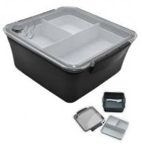 Contenant hermétique pour aliments - 1750 ml - Polypropylène 5 - 3 compartiments - Livré avec une fourchette - Passe au micro ondes et au lave vaisselle - Granti sans BPA - Coloris gris - Existe également en rouge, bleu, vert - Dimensions 19.4 x 18.7 x 8.5 cm