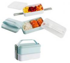 Lunch box en plastique - 2 compartiments séparés et fermés par un couvercle - couverts intégrés, 1 fourchette, 1 couteau et une cuillère en plastique - poignée de transport - assemblage et fermeture de la lunch box à l'aide d'une bande silicone - compatible micro-ondes et lave-vaisselle - dimensions 20 x 11 x 13.50 cm