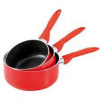 Set de 3 casseroles, revêtement intérieur en particules de pierre durcies, revêtement extérieur rouge en aluminium, manche de 16 cm en silicone rouge, compatible tous feux dont induction, cuisson sans ajout de matière grasse.