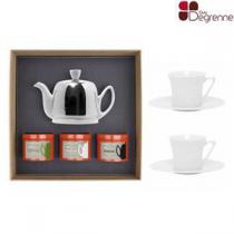 Ce coffret est composé d'une théière Salam (2 tasses) et de 2 tasses accompagnées de trois boites de thé (vert, blanc et noir).