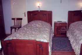 Chambre à 2 lits jumeaux, cuisine, sanitaires privatifs, mobilier de jardin et chaises longues. Petit déjeuner servi dans la salle à manger ou sur la terrasse.