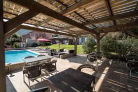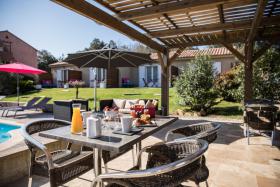 Les petits-déjeuners sont servis dans la cuisine d'été au bord de la piscine ou dans la salle à manger.