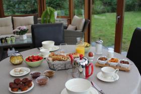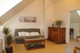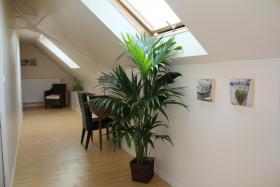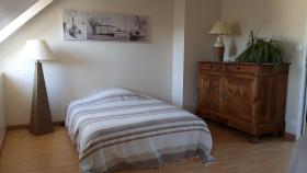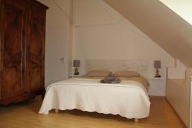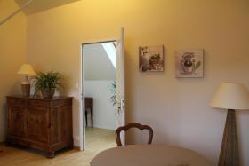 Suite spacieuse (60m2), à l'étage avec accès indépendant, comprenant un salon avec canapé convertible (pour 2 personnes), un espace bureau bibliothèque, une salle d'eau et une grande chambre (lit 160). Le petit déjeuner est servi dans la véranda ou le jardin.