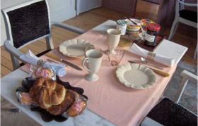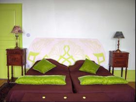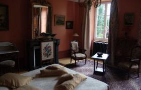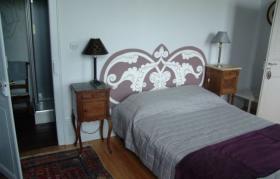 Chambre pour 2 personnes située au 1er étage de la maison, décorée dans les tons blancs et prune avec des meubles de style et possède une cheminée lorraine. Salle d'eau attenante et WC privatif.