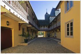 Unique en Béarn, la cour intérieure avec sa galerie toute en couleurs et ses peintures en trompe l'œil.