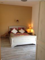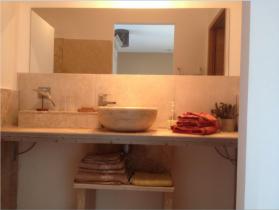 Chambre pour 2 personnes, avec entrée privative sur l'arrière de la maison. Lit 2 personnes, salle d'eau privative (douche italienne) avec wc (beaux matériaux). Espace extérieur réservé aux hôtes, sur le jardin ou sous le pool house. Un joli endroit, au calme.