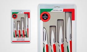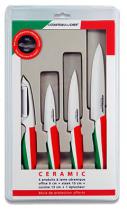 Coffret 4 pièces céramiques composé de : - 1 rasoir à légumes 4 cm, 1 office 9 cm, 1 couteau à steak 10 cm, 1 couteau de cuisine 13 cm - Présentation dans une boîte sous coque - Design aux couleurs de l'Italie - Matière : Lames céramiques très haute dur