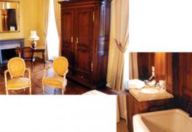 Cinq chambres spacieuses et très confortables, superbement agencées, occupent le premier étage ; elles sont desservies par un ascenseur et un escalier monumental occupant un vaste hall à plafond à caisson.